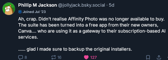 On October 24, the Affinity site halted all sales and placed a "Creative Freedom Is Coming!" teaser message on the front of the site. On October 30, the site revealed Affinity products are now free for everyone, forever. The problem they didn't address was what paid customers would get instead of a refund. A lot of previous customers are rightfully annoyed, some of them making sure they keep backups of installers in case the installers go bye-bye in favor of a web version. I doubt the old versions will go away. It costs Canva basically nothing to keep hosting those files for the few customers who want to stick with the old version as long as they can. That said, the safest path is finding a good open source alternative.