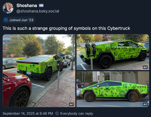 Shoshana posted photos of a rather bizarre green paint job on a Tesla Cybertruck. If that's not worthy of a Halloween outfit mention, I don't know what is! Honestly, it's just weird, and I know it's too early for Halloween, but why else would you do this kind of paint job? Oh....