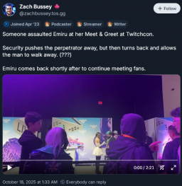 This news hit me from many sources all at once, but the post that initially got my attention was a clip posted by Zach Bussey of the incident. Twitch Con footage shows the assailant calmly walked up to Emiru out of turn and grabbed her in a kind of hugging form and tried to get a kiss or something like that. It was really hard to tell what exactly he managed to do to her other than hug her, but it is clear she did not expect or want his presence. The security crew at the event pushed him off her but then let him go with no repercussions.