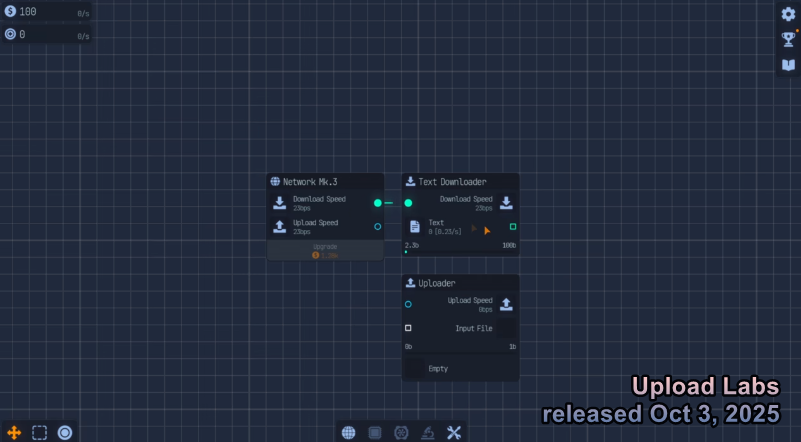 We saw a free indie factory automation game, Upload Labs, release October 3. The game released on Android and Steam at the same time in very similar states with a good early game and the ability to transfer your save via an in-game menu code system between devices. I played the game on 2 different tables, a phone, a laptop and a gaming PC and saw no major issues. The late game is very unfinished and needs a lot of care, but the concepts can easily be expanded on. I have high hopes for this one, but word of caution: the mobile version has some serious performance issues after watching an ad for coins.